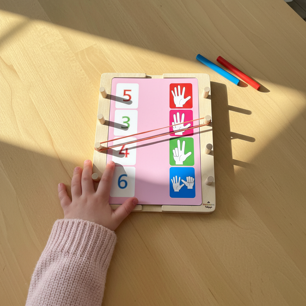 Öğrenme ve motor becerileri bir ahşap çerçevede birleşiyor! Öğrenme kartları, bulmacalar, problem çözmeyi teşvik ederken, lastik bantlarla doğru resimleri birleştirmeniz gerekiyor. Bantları germeye hazır mısınız?
