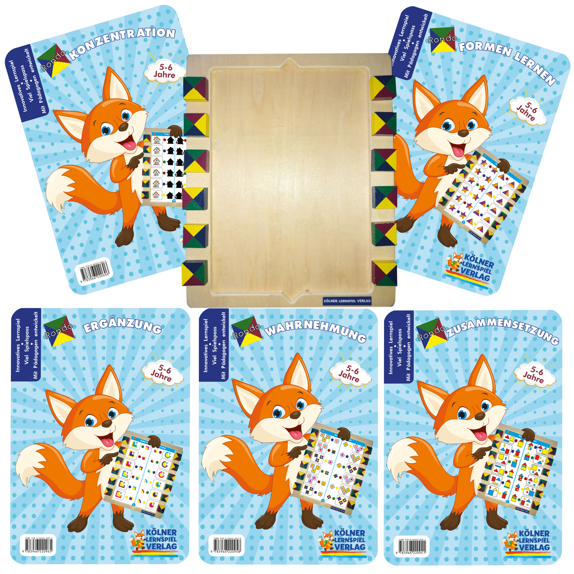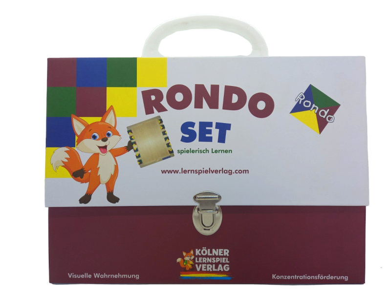 Der Rondo Koffer beinhaltet das Rondo Grundgerät mit 5 Kartensätzen mit je 14 Karten für Kinder ab 5 Jahren.