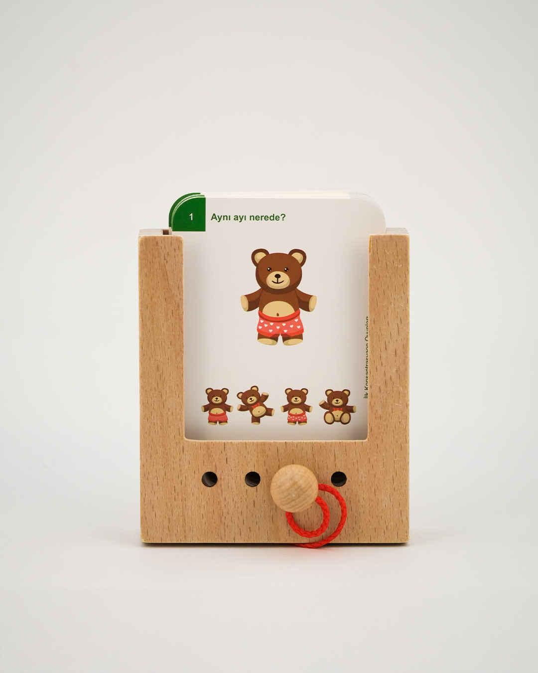 Kartlar ahşap kutuya yerleştirilir, kutuya bağlı şekilde bulunan pin ile doğru olduğu düşünülen cevap seçilir. Cevap doğru ise kart yerinden çıkar. Yanlış ise kart hareket etmez. Bu sayede çocuklar farklı cevap seçeneklerini deneyerek doğru cevabı bulur.