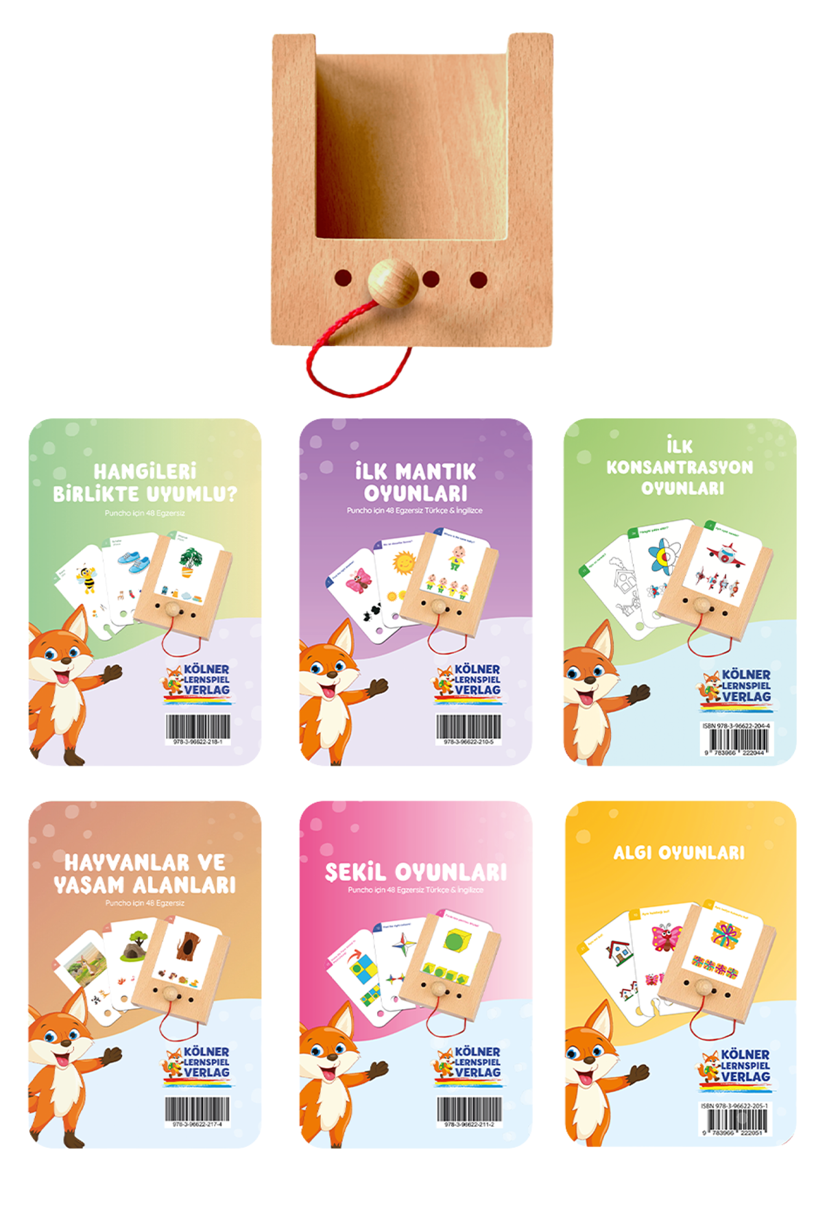 Set içerisinde bir adet Ahşap Puncho Kutusu ve altı adet 3-4 yaşa uygun kart seti yer almaktadır. Her kart seti 48 alıştırmadan oluşur.