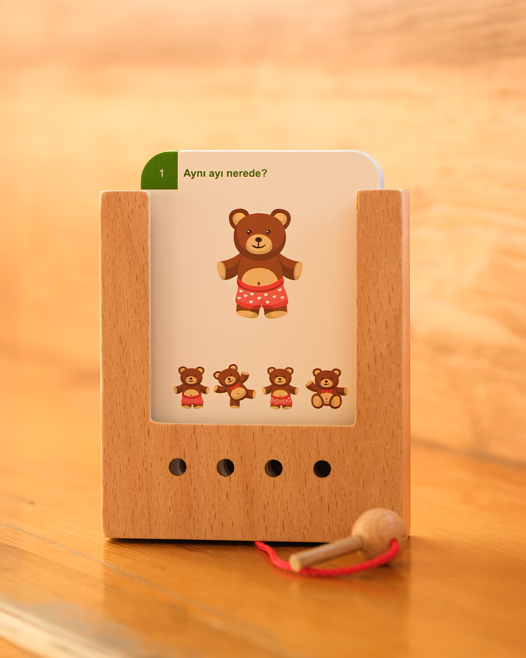 Kartlar ahşap kutuya yerleştirilir, kutuya bağlı şekilde bulunan pin ile doğru olduğu düşünülen cevap seçilir. Cevap doğru ise kart yerinden çıkar. Yanlış ise kart hareket etmez. Bu sayede çocuklar farklı cevap seçeneklerini deneyerek doğru cevabı bulur.